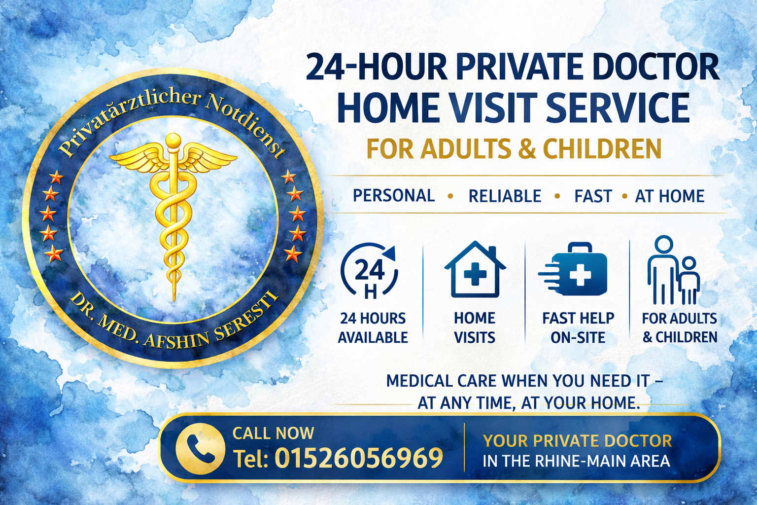 Looking for a private doctor home visit in Frankfurt, Wiesbaden, Mainz, Darmstadt or the Rhine-Main area? Dr. Afshin Seresti provides 24-hour private medical home visits for adults and children – day and night, including weekends and public holidays.